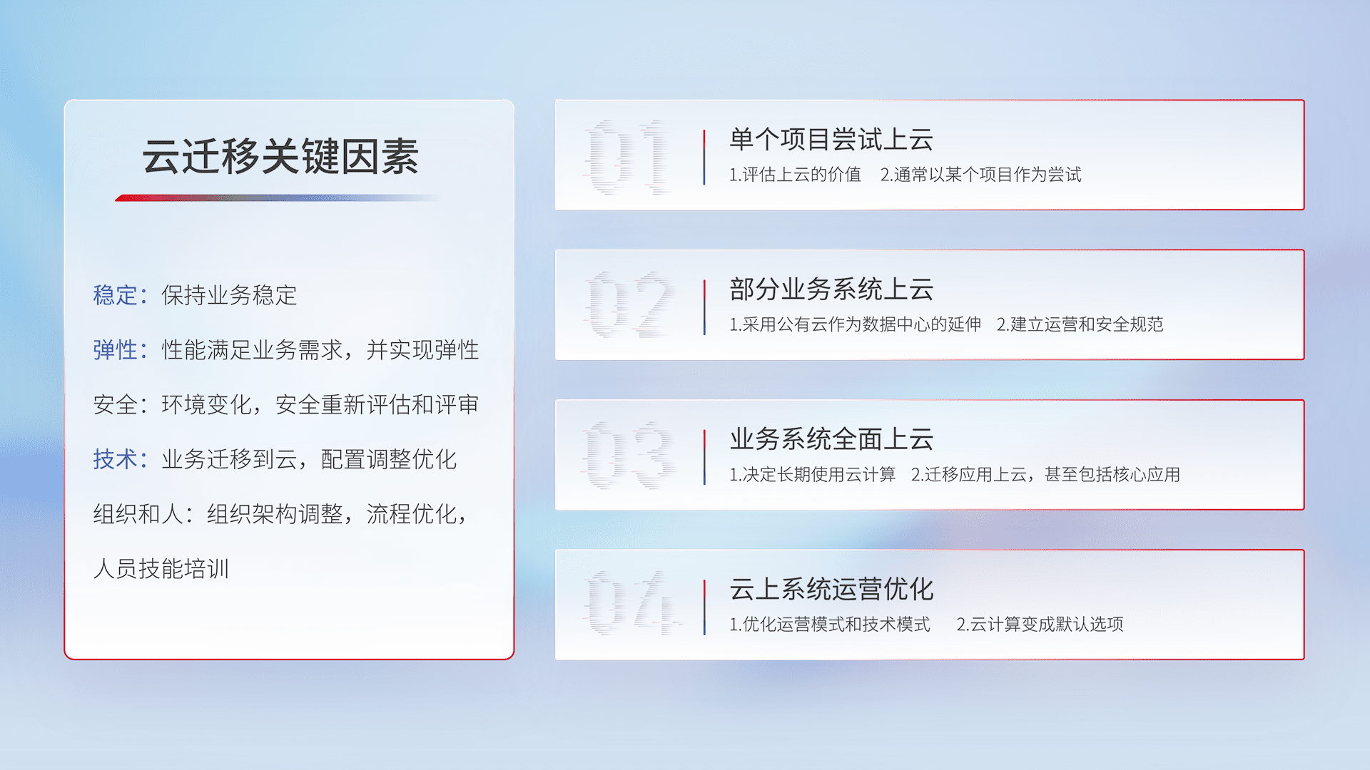 结合实际业务,,,从规划设计、、、、云平台选型、、、、云原生改造、、数据迁移、、、、集成交付,,迁移全过程为客户识别最佳上云路径,,,,做好风险识别管理,,,设计网络架构、、、身份权限、、安全审计合规、、、操作审计、、日志审计、、、监控告警策略、、多站点容灾设计等,,,对云上基础设施进行整体规划,,,提升IT治理水平,,以满足弹性、、高可用、、、高性能的需求。。