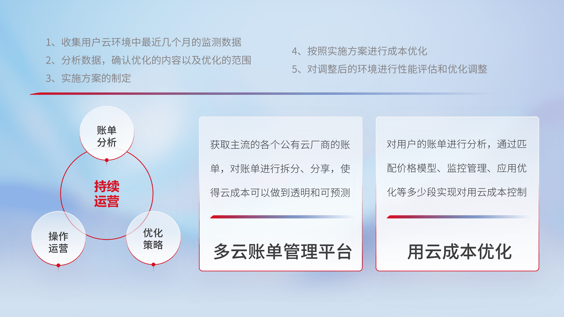 通过多云纳管,,以统一的资源数据模型把客户的云资源进行抽象和封装,,,,进而实现对多云资源的统一操作,,,,保障云资源管理的可靠性、、、、稳定性与可用性。。。。量身定制化运维内容,,,配置、、、开发运维、、、、补丁管理、、、、备份、、、监控、、认证和访问管理、、、审计和日常巡检等,,,保障在用云过程中的可靠度,,,稳定度以及高可用率。。