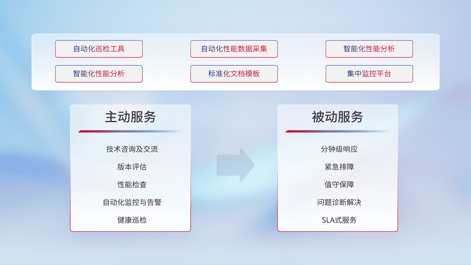 智能化工具和标准化文档,,,保障服务质量,,,,提供主动服务(包含技术咨询、、、版本评估、、性能检查、、、自动化监控与告警、、、健康巡检)和被动服务包含(分钟级响应、、紧急排障、、值守保障、、问题诊断解决、、SLA服务)。。